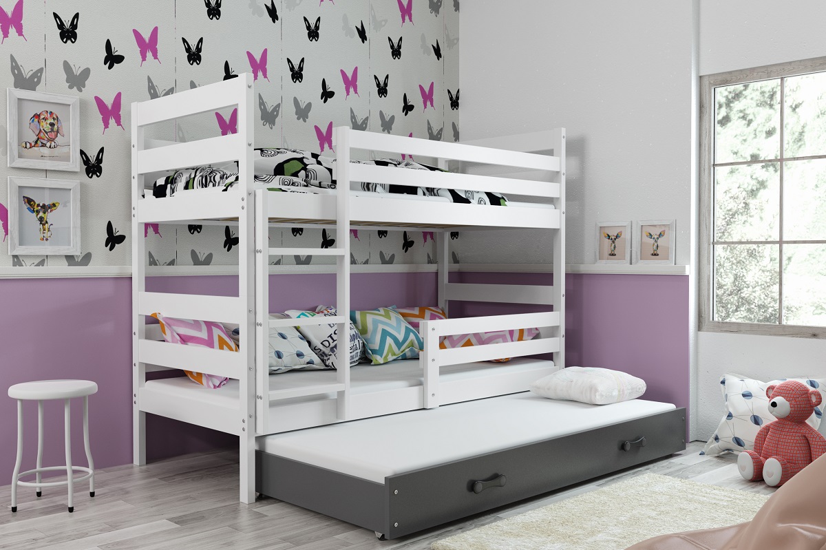 Dětská patrová postel Eryk 3 s přistýlkou je vhodná pro plnohodnotné spaní tří dětí.