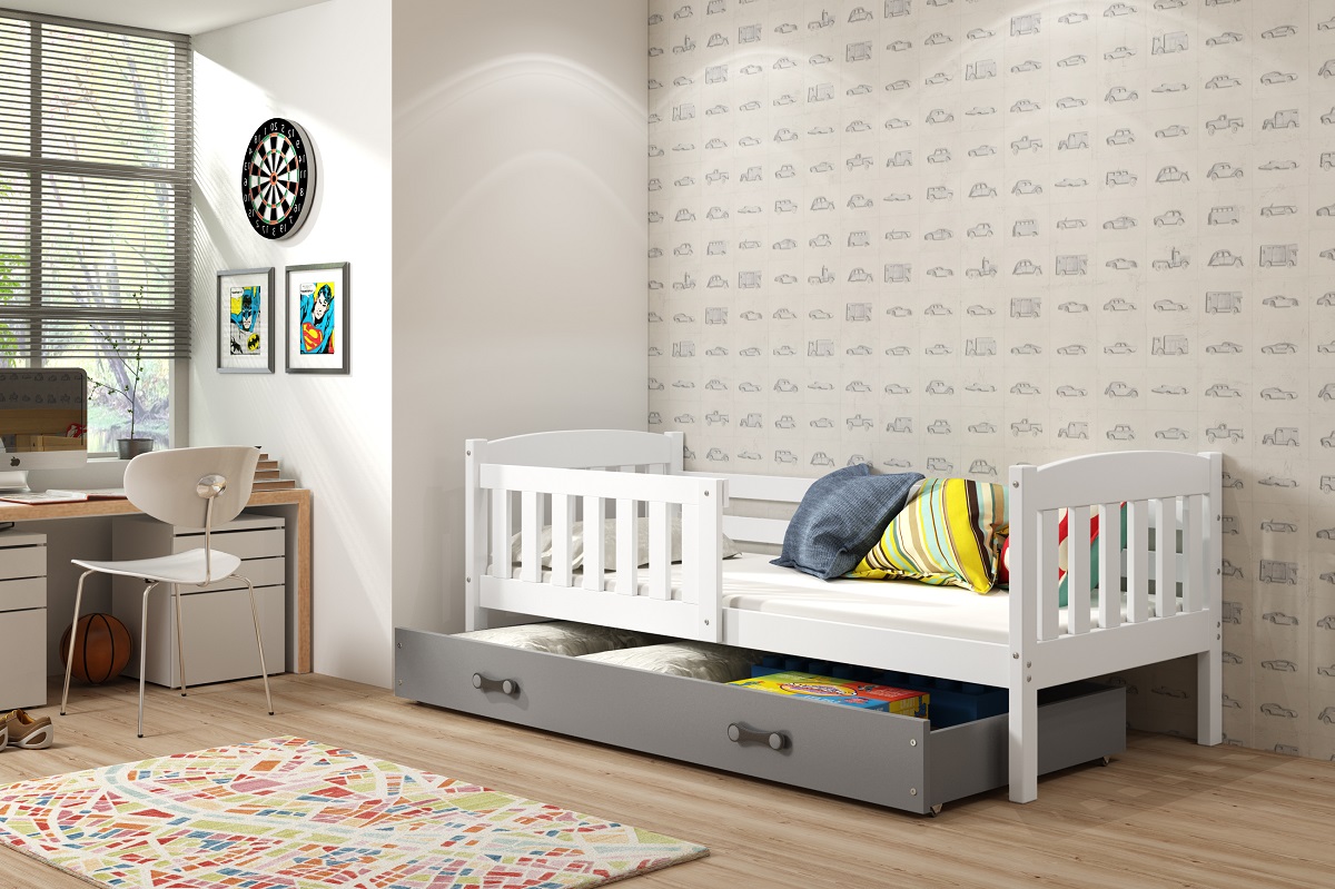 Dětská postel s úložným prostorem nabízí praktické řešení pro úsporu místa a uspořádání dětského pokoje. Díky integrované zásuvce je ideální pro uložení hraček, oblečení či lůžkovin. Postel je dostupná v mnoha barevných kombinacích, takže snadno zapadne do jakéhokoli interiéru a umožní vytvořit dětský pokoj přesně podle vkusu dítěte. Kvalitní materiály a pevná konstrukce zajišťují dlouhou životnost a bezpečné používání. Postel je vyrobená z borovicového dřeva, barevné díly jsou oboustraně lakovené MDF.