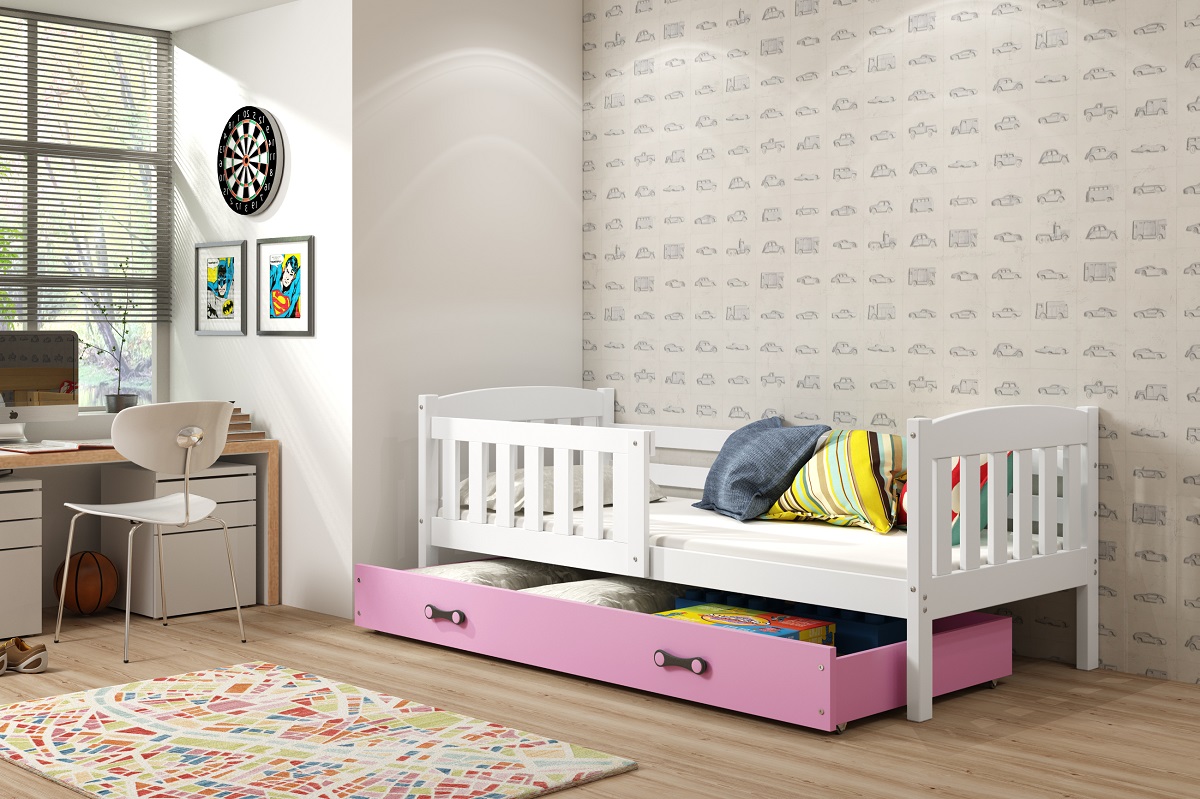 Dětská postel s úložným prostorem nabízí praktické řešení pro úsporu místa a uspořádání dětského pokoje. Díky integrované zásuvce je ideální pro uložení hraček, oblečení či lůžkovin. Postel je dostupná v mnoha barevných kombinacích, takže snadno zapadne do jakéhokoli interiéru a umožní vytvořit dětský pokoj přesně podle vkusu dítěte. Kvalitní materiály a pevná konstrukce zajišťují dlouhou životnost a bezpečné používání. Postel je vyrobená z borovicového dřeva, barevné díly jsou oboustraně lakovené MDF.