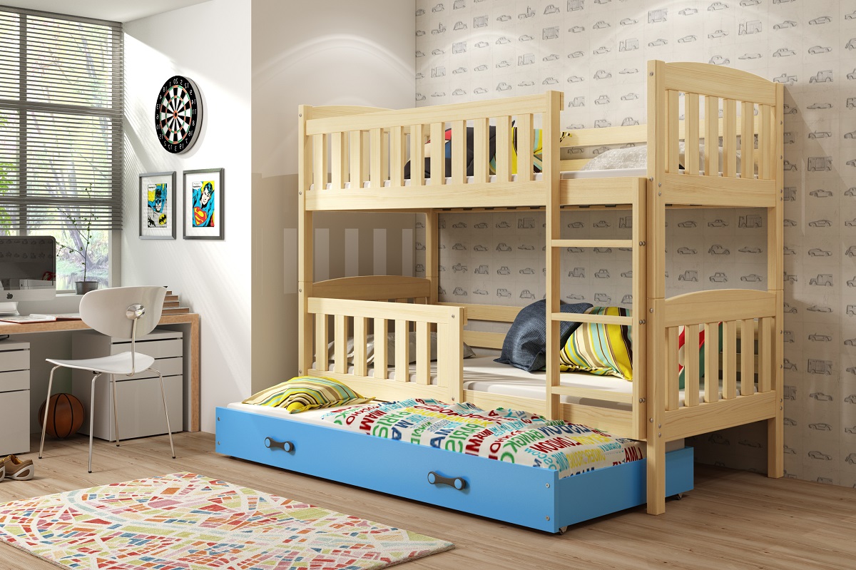 Dětská patrová postel Kubus s přistýlkou je vhodná pro plnohodnotné spaní tří dětí.