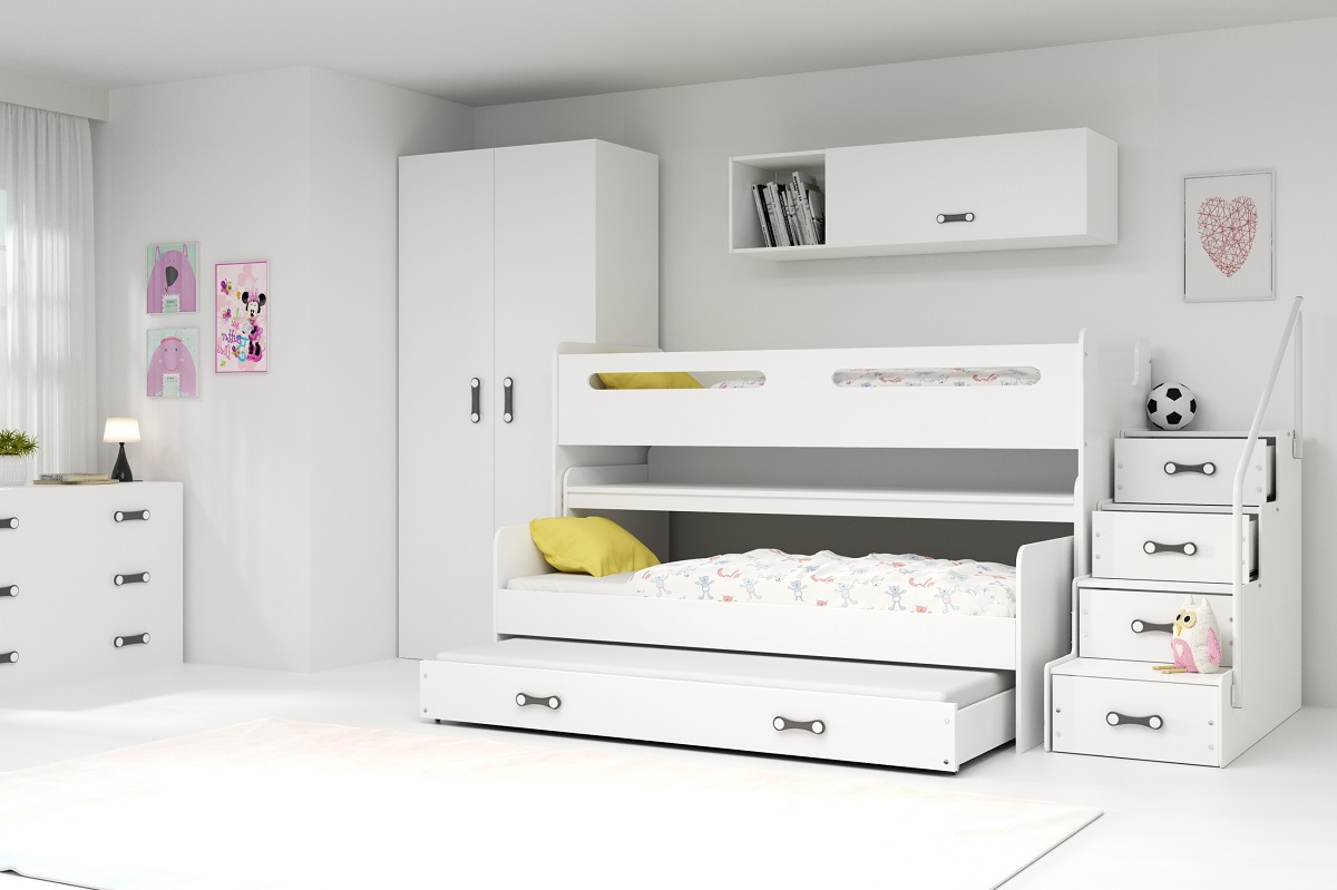 Dětská patrová postel Max 1 s přistýlkou, schůdky a vysouvacím stolem, včetně 3 matrací a 3 roštů zdarma, je určená pro 3 děti.