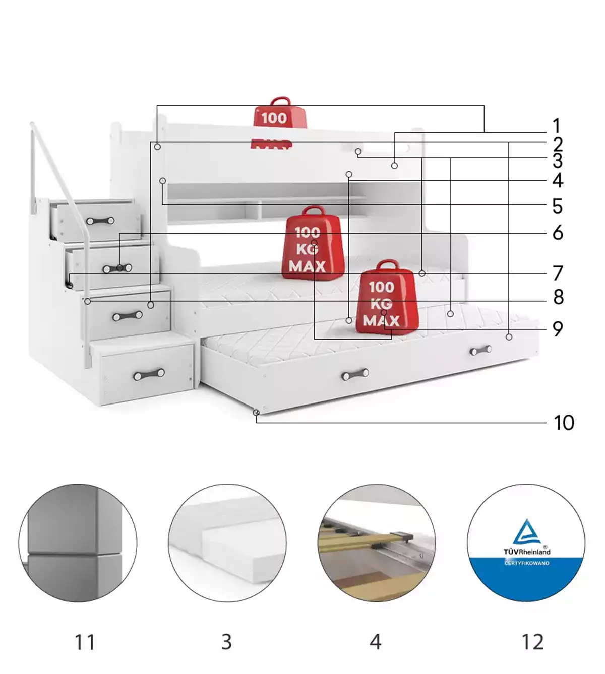 Postel disponuje několika velkými úložnými prostory. Postel Max 3 se schůdky umožňuje jednoduchý a bezpečný přístup na horní postel. Schůdky je možné variabilně umístit na obě strany postele.