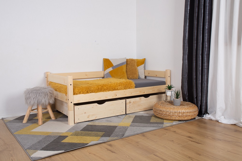 Dětská postel Mia s úložnými šuplíky potěší oko každého rodiče, který má rád jednoduchý design. Postel je vyrobena z kvalitního českého dřeva a je vhodná nejen do dětského pokoje, ale i do studetského pokoje či pokoje pro hosty. Díky své nosnosti poslouží k spánku i dospělým osobám. Pokud by postel byla koupena pro menší dítě, nabízíme možnost dokoupení bezpečnostní zábrany. Úložného prostoru je vždy nedostatek, proto jsou k posteli připojené také dva úložné šuplíký, které pojmou lůžkoviny, hračky ale i spoustu dalšího. Tato varianta dvou menších úložnych šuplíku je zejména pro menší děti lepší na manipulaci a také ji oceníte, pokud vedle postele máte noční stolek a celý šuplík by nešel otevřít.