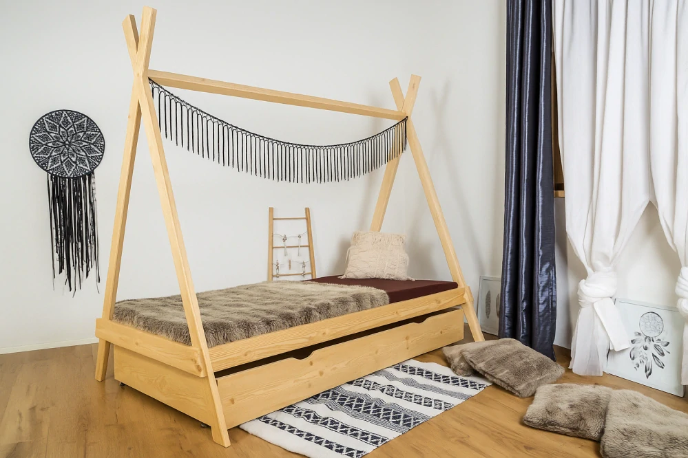 Dětská postel Teepee je snem každého malého indiána. Postel je vyrobena z kvalitního českého dřeva tak, aby byla nejen bezpečná, ale také pro děti zajímavá. Konstrukce dětské postele je jak stvořená pro vytváření nebotyných indiánských pevností. Nabízíme možnost dokoupení bezpečnostích zábran, které zabrání vypadnutí dítěte z postele anebo zapadnutí hračky za postel. Pro uschování indiánských kostýmu poslouží u dětské postele úložný šuplík.