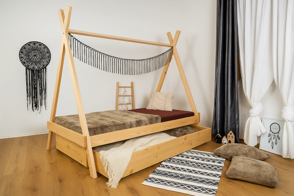 Dětská postel Teepee je snem každého malého indiána. Postel je vyrobena z kvalitního českého dřeva tak, aby byla nejen bezpečná, ale také pro děti zajímavá. Konstrukce dětské postele je jak stvořená pro vytváření nebotyných indiánských pevností. Nabízíme možnost dokoupení bezpečnostích zábran, které zabrání vypadnutí dítěte z postele anebo zapadnutí hračky za postel. Přistýlka k dětské posteli má rošt a unese nejen kamaráda, sourozence, ale i také rodiče pro čtení pohádek na dobrou noc.