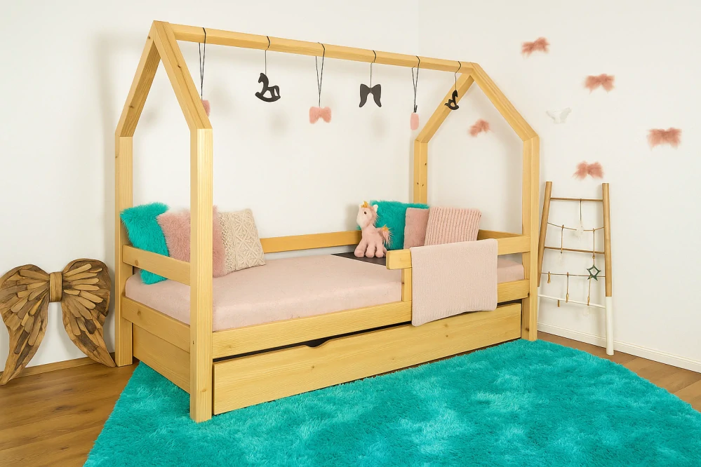 Dětská postel Snílek s šuplíkem je domeček pro každého malého rošťáka. Děti u této dětské postele ocení pohodlí, vzhled a možnost na konstrukci postele věšet dekorace a také deky na stavění bunkrů. Rodiče ocení zajištění bezpečnosti díky kvalitní konstrukci z českého dřeva a také metrové odnímatelné zábraně. Úložný šuplík pod dětskou postelí je dobře využitelný na lůžkoviny a hračky.