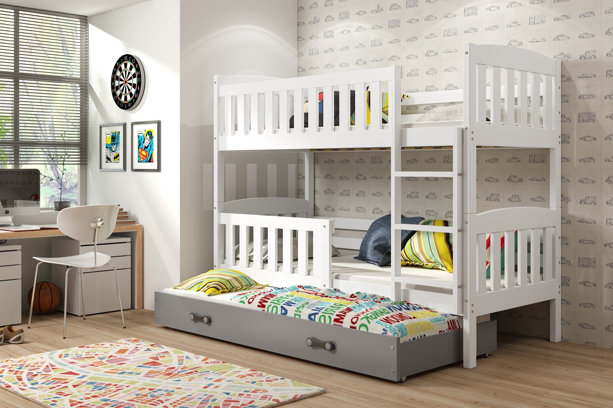 Dětská patrová postel Kubus s přistýlkou je vhodná pro plnohodnotné spaní tří dětí.