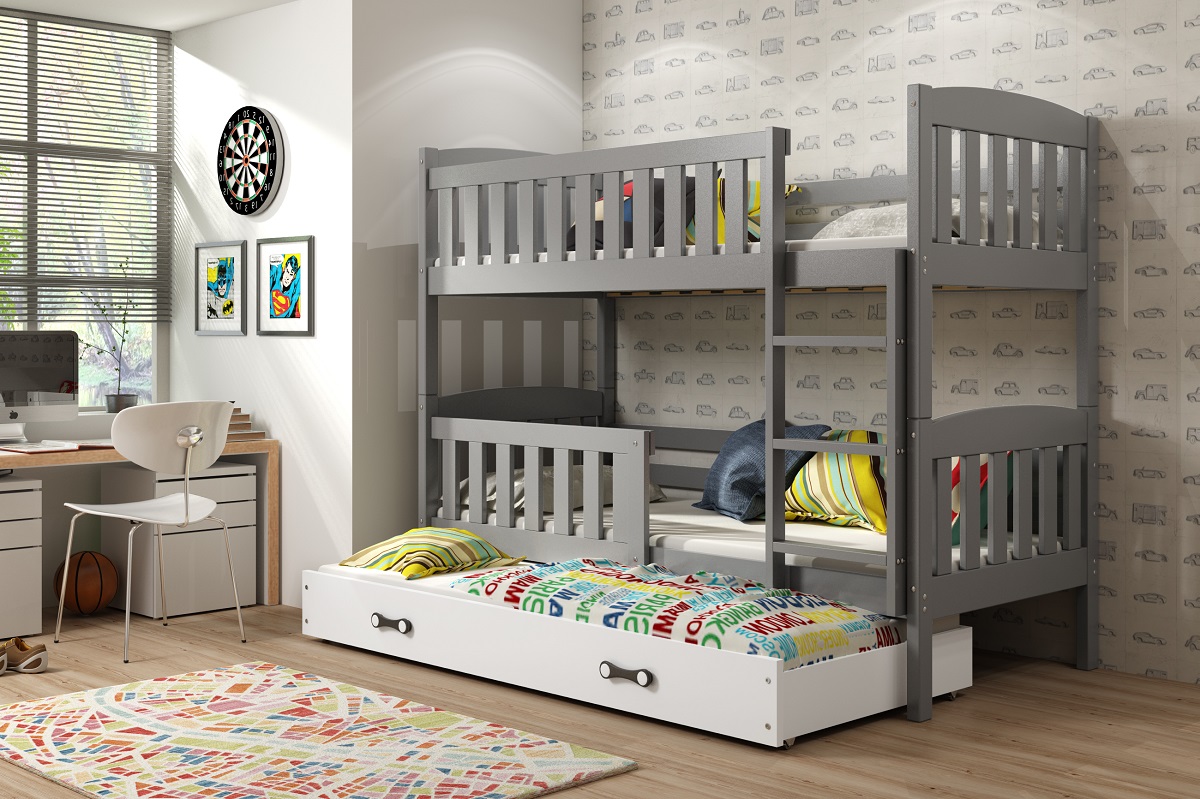 Dětská patrová postel Kubus s přistýlkou je vhodná pro plnohodnotné spaní tří dětí.