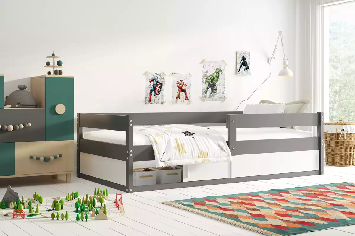 Tato dětská postel se zábranou je ideální volbou pro bezpečný spánek i těch nejmenších dětí. Díky praktickým zábranám na stranách poskytuje maximální ochranu a klidný spánek. Postel navíc nabízí chytré řešení s úložným prostorem pod postelí, který je ideální pro uskladnění hraček, ložního prádla nebo oblečení. Součástí balení je také matrace a rošt, takže je postel ihned připravena k použití. Spojuje bezpečnost, komfort a praktické využití prostoru v jednom moderním designu. Postel je vyrobená z borovicového dřeva, barevné díly jsou oboustraně lakovené MDF.