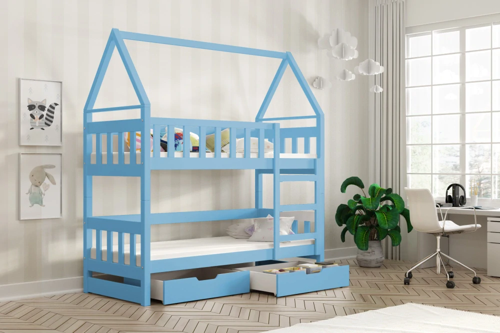 Objevte kouzlo dětského pokoje s naší patrovou postelí ve tvaru domečku, která spojuje funkčnost, bezpečí a hravý design! Tato postel je ideálním řešením pro sourozence nebo malé děti, které milují prostor pro hraní i odpočinek.