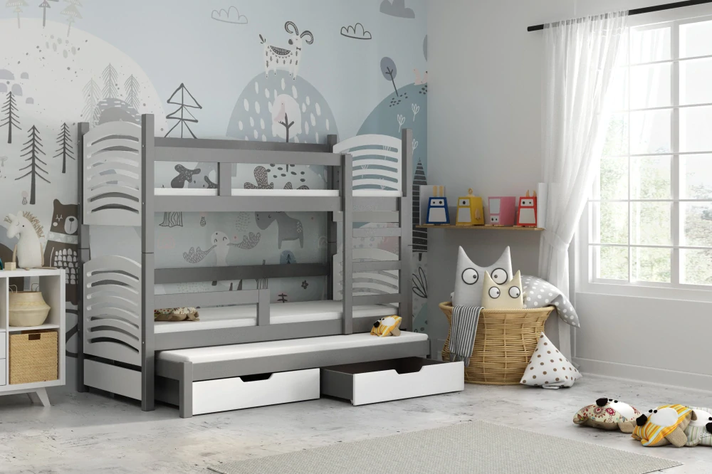 Dětská patrová postel pro 3 děti s úložnými šuplíky – chytré řešení do dětského pokoje