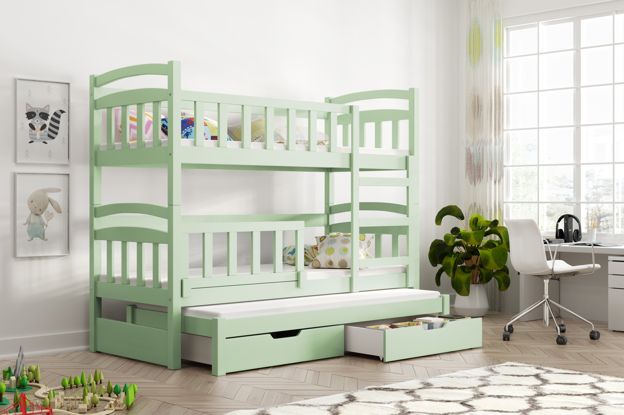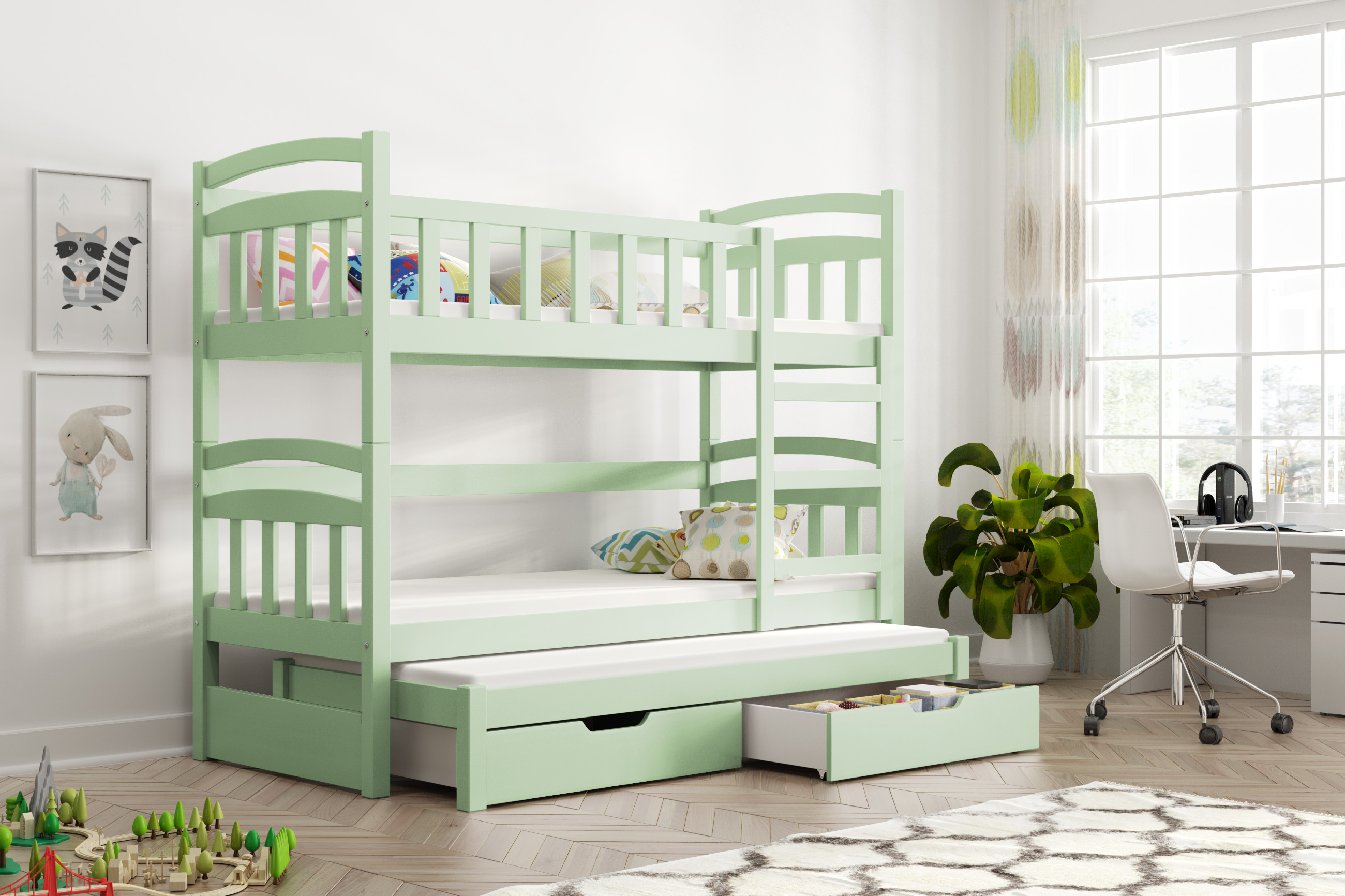 Dětská patrová postel pro 3 děti s úložnými šuplíky – chytré řešení do dětského pokoje
