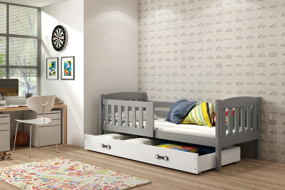 Dětská postel s úložným prostorem nabízí praktické řešení pro úsporu místa a uspořádání dětského pokoje. Díky integrované zásuvce je ideální pro uložení hraček, oblečení či lůžkovin. Postel je dostupná v mnoha barevných kombinacích, takže snadno zapadne do jakéhokoli interiéru a umožní vytvořit dětský pokoj přesně podle vkusu dítěte. Kvalitní materiály a pevná konstrukce zajišťují dlouhou životnost a bezpečné používání. Postel je vyrobená z borovicového dřeva, barevné díly jsou oboustraně lakovené MDF.