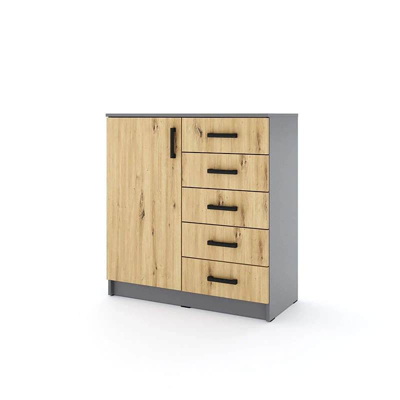 Komoda je vyrobena z kvalitní laminované desky, která je odolná proti běžnému opotřebení. Díky jednoduchému designu ji snadno zkombinujete s dalším nábytkem a vytvoříte tak čistý a moderní interiér.
