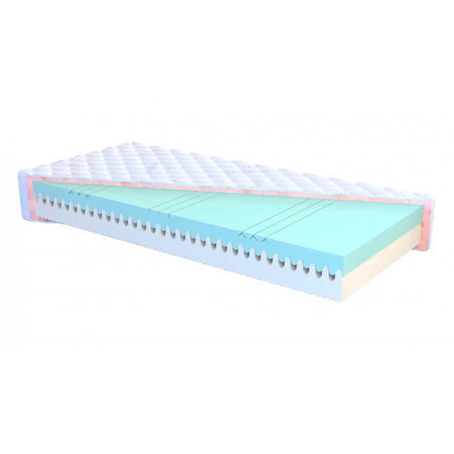 Pětizónová oboustranná polyuretanová matrace s větracími komůrkami a rozdílnou tvrdostí stran. Materiál potahu Polyester jersey prošitý polyesterovým rounem z dutého vlákna. Materiál jádra Zelená strana je vyrobena z kvalitní polyuretanové pěny typu T2837 a bílá strana je vyrobena z kvalitní polyuretanové pěny typu T3037.