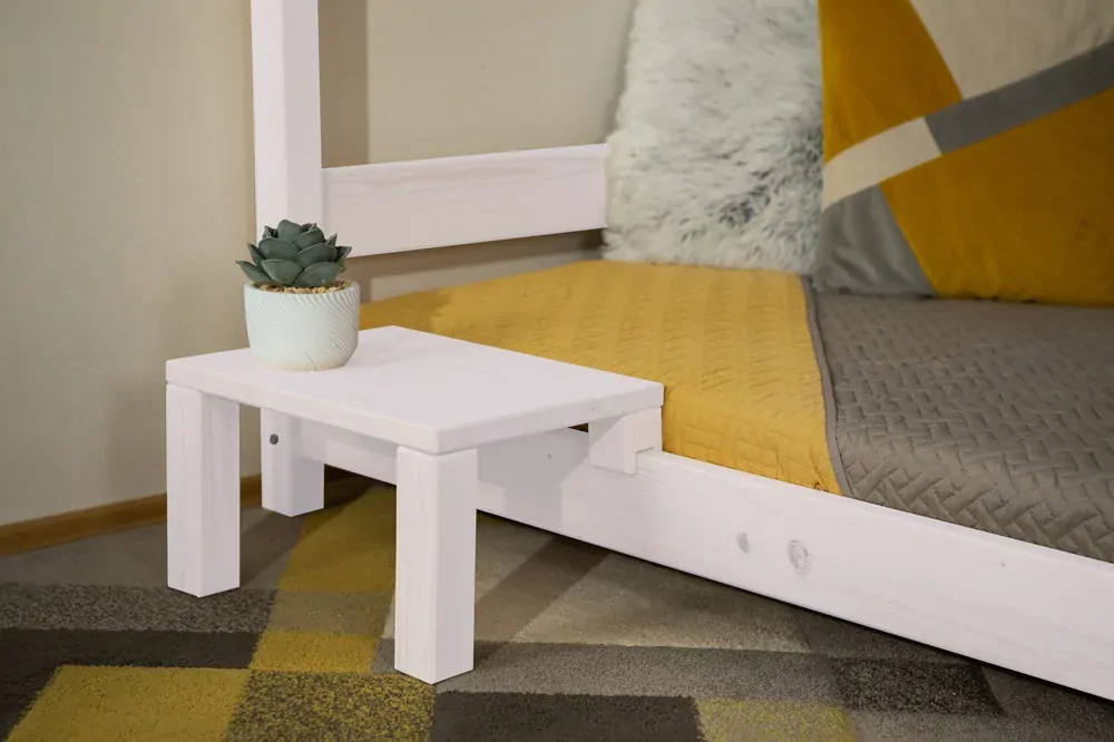 Stolek je navržen tak, že ho lze nasadit na rám postele o tl. 27mm - všechny postele zn. Maxido . Stolek lze na postel nasadit z obou stran. Nohy stolu jsou k desce stolu spojeny pomocí kolíku a lze je kdykoliv vyměnit např. za vyšší nohy, při pořízení vyšší postele.