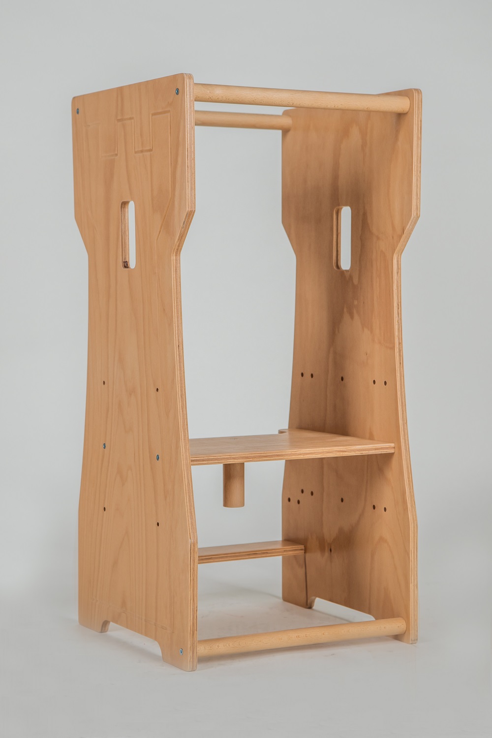 Dřevěná učící věž je nedílnou součástí každé rodiny s malými dětmi. Děti milují pomáhat rodičům v kuchyni, dílně nebo na sebe dobře vidět v zrcadle při mytí zoubku. Díky multifunkční věži jim všechny tyto místa budou blíže a dostupnější. Věž je výškově nastavitelná do 3 poloh. Učící věž je druhým krokem tohoto produktu a to jídelní židličky. Po otočení z věže vznikne jídelní židlička, která je vhodná pro dítě od chvíle, kdy dítko samo sedí díky nastavitelné výšce posedu. Bezpečnost proti vypadnutí zajištuje kolík, který je odnímatelný. Pro malé malíře a tvořitele je možnost dokoupit pracovní desku, která z věže udělá pracovní stoleček. Tento stoleček dětí mohou využít také k posezení s kamarády.