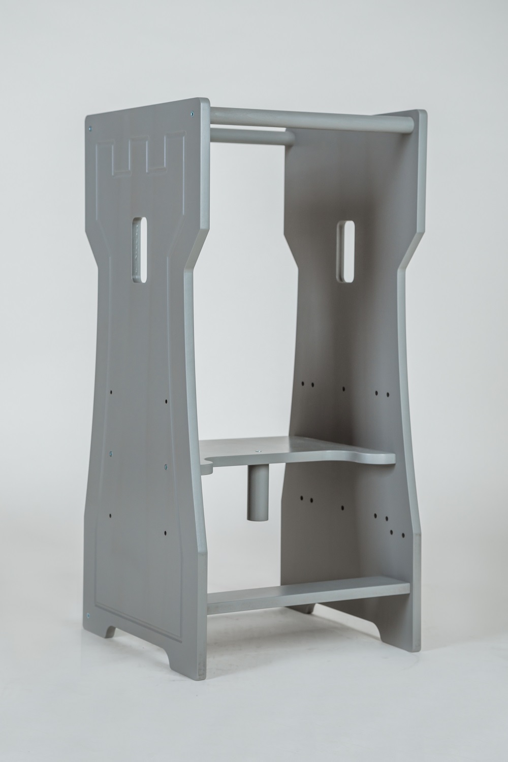 Dřevěná učící věž je nedílnou součástí každé rodiny s malými dětmi. Děti milují pomáhat rodičům v kuchyni, dílně nebo na sebe dobře vidět v zrcadle při mytí zoubku. Díky multifunkční věži jim všechny tyto místa budou blíže a dostupnější. Věž je výškově nastavitelná do 3 poloh. Učící věž je druhým krokem tohoto produktu a to jídelní židličky. Po otočení z věže vznikne jídelní židlička, která je vhodná pro dítě od chvíle, kdy dítko samo sedí díky nastavitelné výšce posedu. Bezpečnost proti vypadnutí zajištuje kolík, který je odnímatelný. Pro malé malíře a tvořitele je možnost dokoupit pracovní desku, která z věže udělá pracovní stoleček. Tento stoleček dětí mohou využít také k posezení s kamarády.
