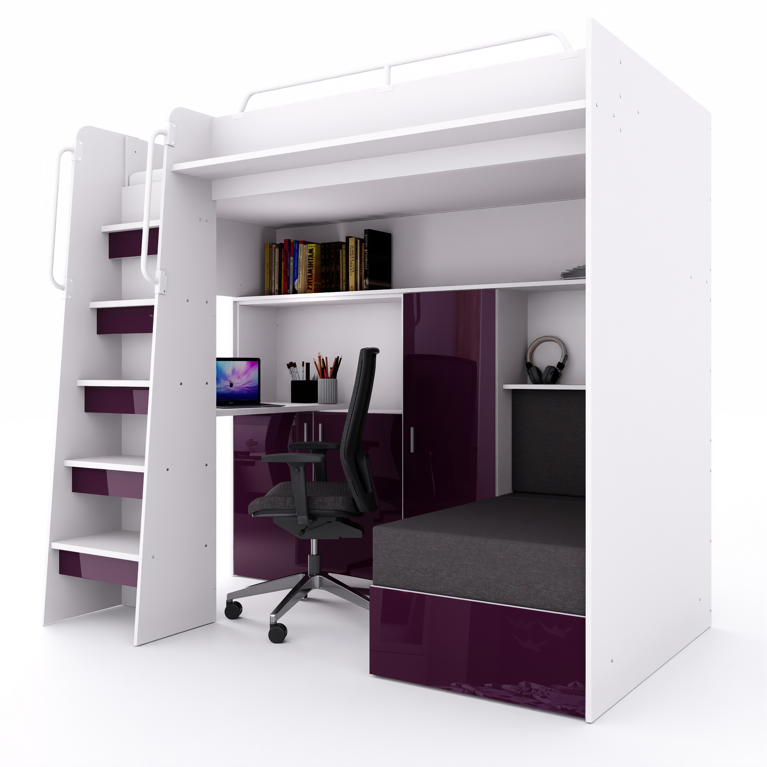 Patrová postel s rozkládací pohovkou, stolem a úložným prostorem