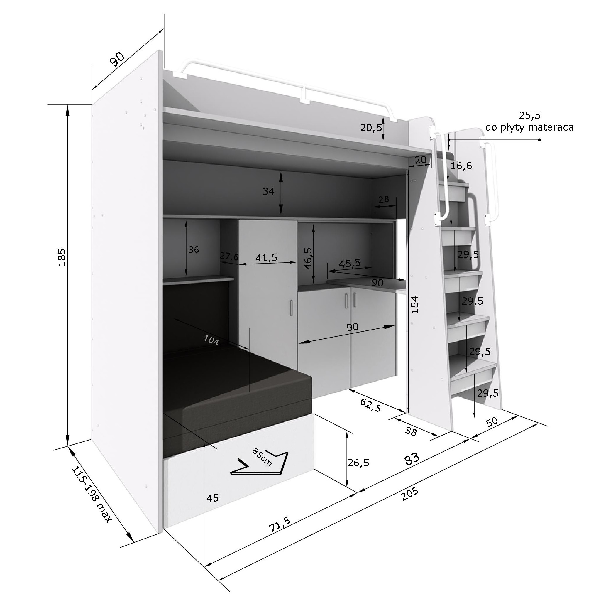Tato patrová postel s rozkládací pohovkou je ideálním řešením pro dětské a studentské pokoje, kde je potřeba efektivně využít prostor. Nabízí nejen pohodlné spaní, ale také praktické úložné prostory a pracovní místo. Horní lůžko o rozměrech 200 × 90 cm poskytuje dostatek místa pro klidný spánek, zatímco dolní část slouží jako pohovka, kterou lze snadno rozložit na lůžko o velikosti 180 x 70 cm. Díky integrovanému psacímu stolu a třem skříňkám je vše potřebné vždy po ruce. Stabilní konstrukce a kvalitní materiály zajišťují dlouhou životnost a bezpečné používání. Moderní design se hodí do různých interiérů a dělá z této postele nejen praktický, ale i stylový kus nábytku.
