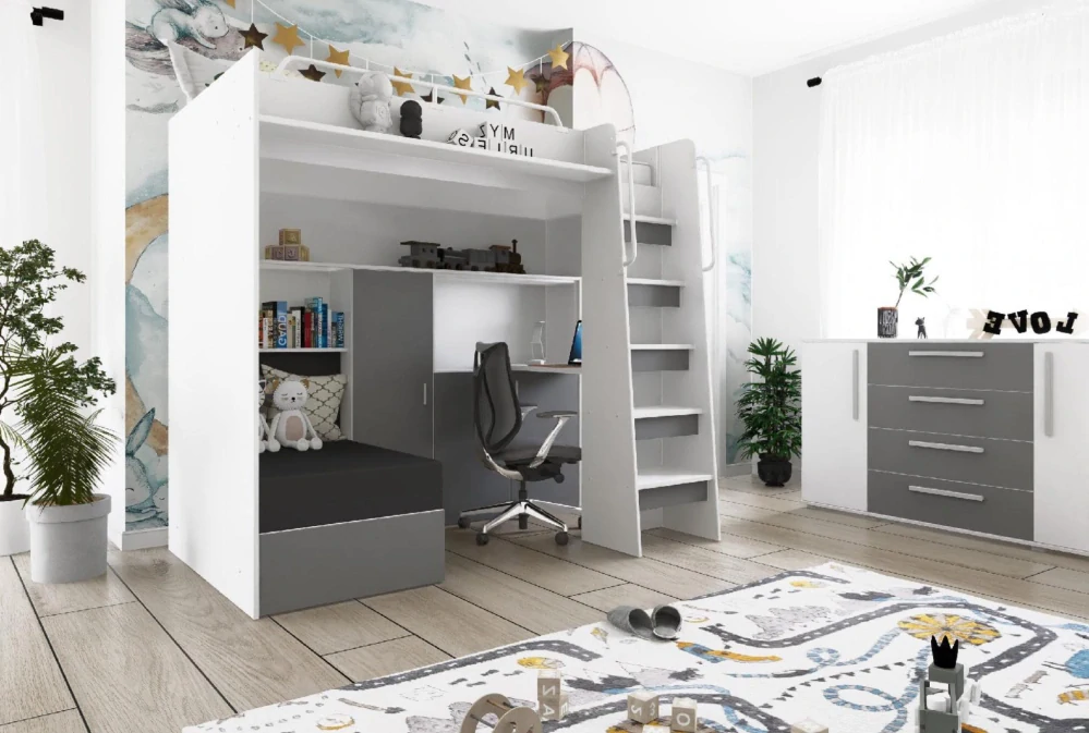 Tato patrová postel s rozkládací pohovkou je ideálním řešením pro dětské a studentské pokoje, kde je potřeba efektivně využít prostor. Nabízí nejen pohodlné spaní, ale také praktické úložné prostory a pracovní místo. Horní lůžko o rozměrech 200 × 90 cm poskytuje dostatek místa pro klidný spánek, zatímco dolní část slouží jako pohovka, kterou lze snadno rozložit na lůžko o velikosti 180 x 70 cm. Díky integrovanému psacímu stolu a třem skříňkám je vše potřebné vždy po ruce. Stabilní konstrukce a kvalitní materiály zajišťují dlouhou životnost a bezpečné používání. Moderní design se hodí do různých interiérů a dělá z této postele nejen praktický, ale i stylový kus nábytku.