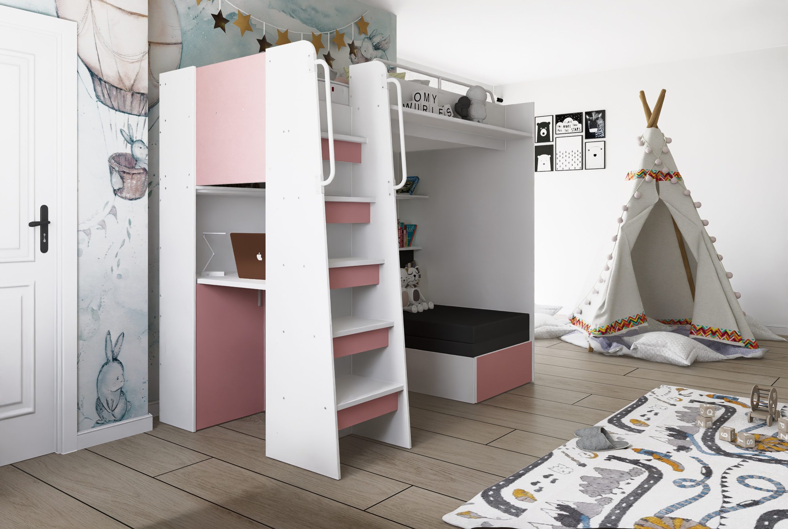 - Psací stůl – praktické pracovní místo pod postelí.