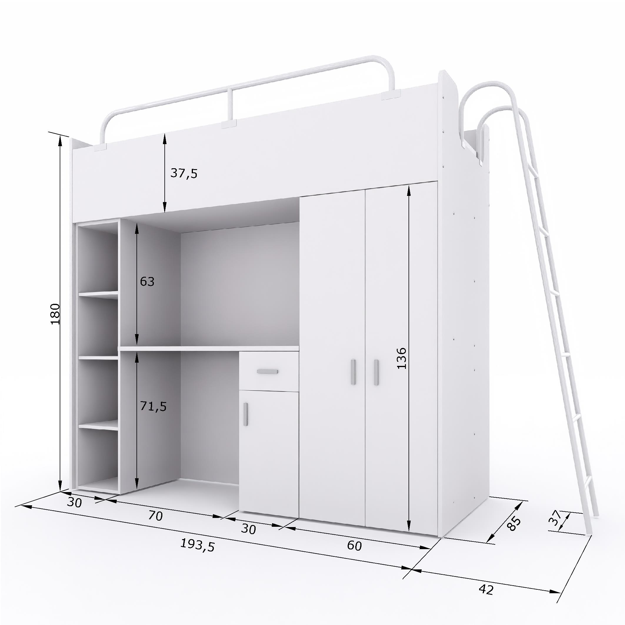 Moderní dětská vyvýšená postel 190x80 cm je ideálním řešením do menších dětských a studentských pokojů. Praktická sestava kombinuje postel, psací stůl, šatní skříň a žebřík v jednom kompaktním celku a šetří tak místo i náklady na samostatný nábytek.