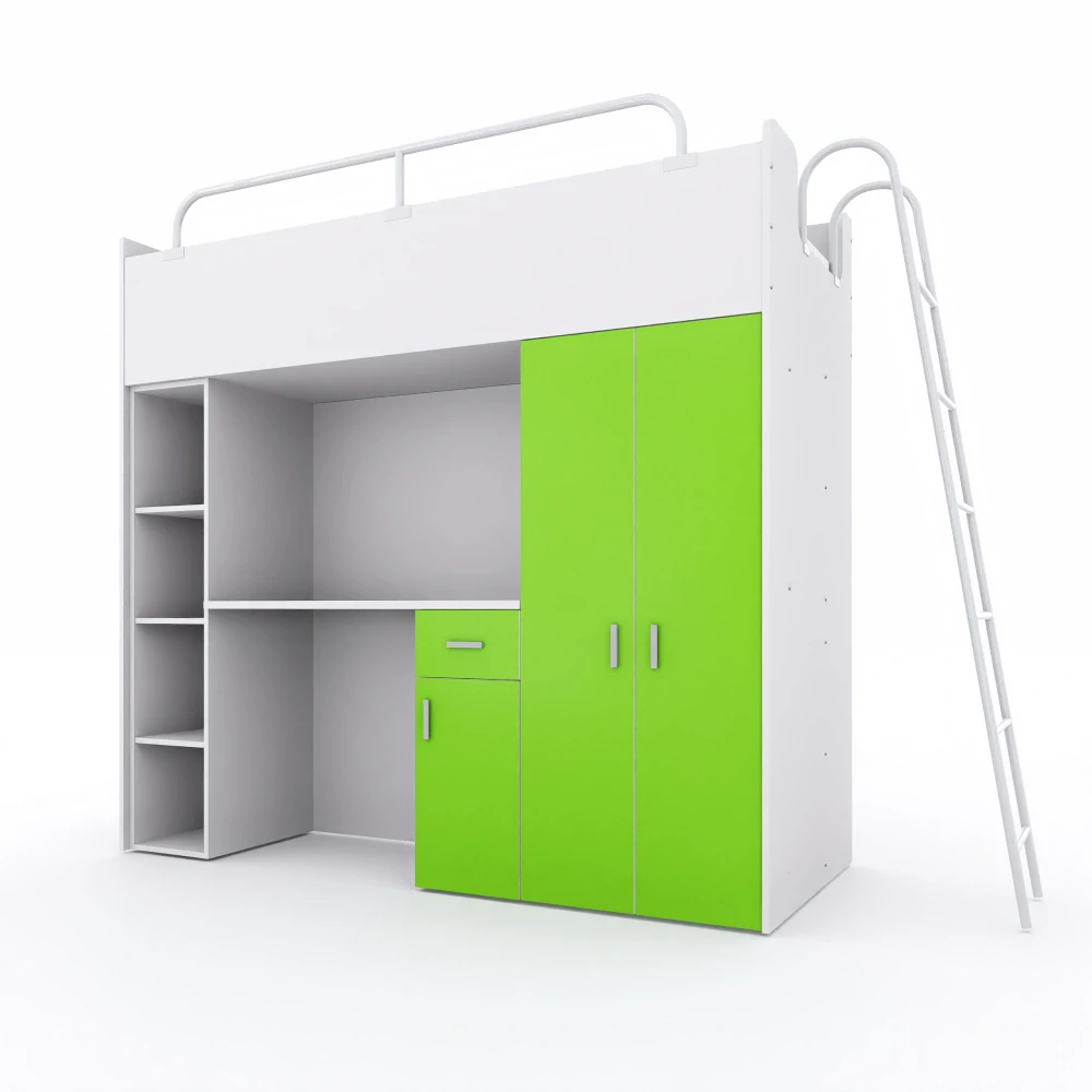 Moderní dětská vyvýšená postel 190x80 cm je ideálním řešením do menších dětských a studentských pokojů. Praktická sestava kombinuje postel, psací stůl, šatní skříň a žebřík v jednom kompaktním celku a šetří tak místo i náklady na samostatný nábytek.