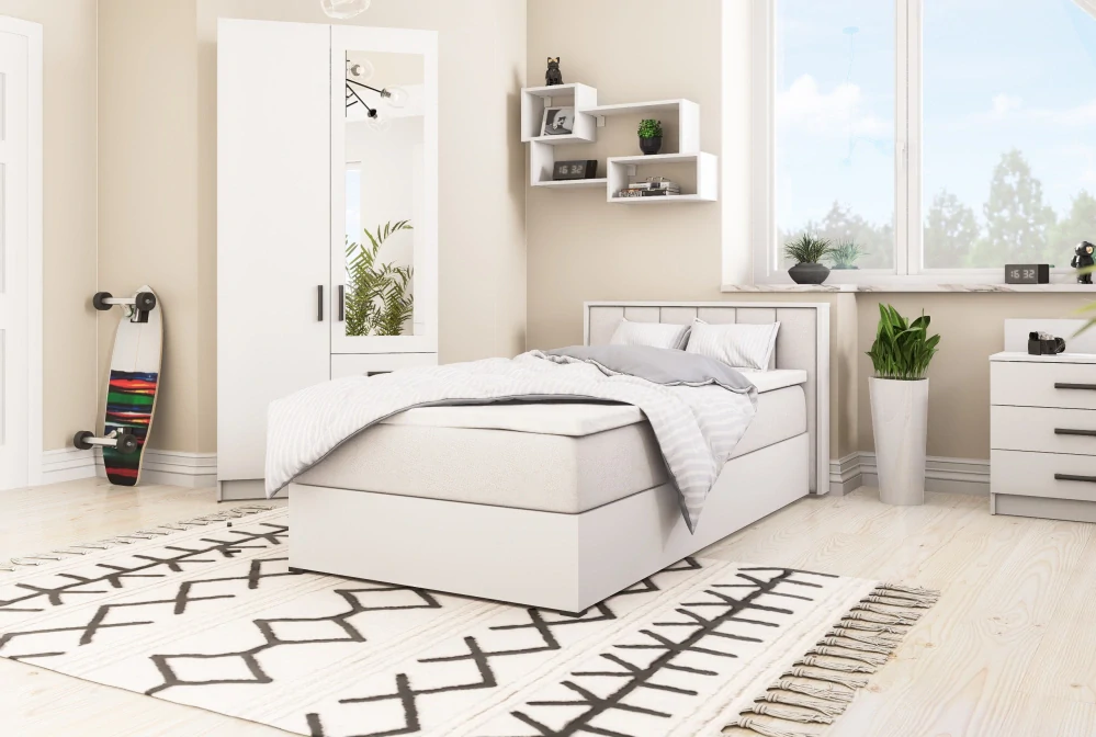 Moderní postel SIGMA v elegantní bílé barvě je skvělou volbou pro dětský pokoj, ložnici i hostinský pokoj. Díky svému jednoduchému a nadčasovému designu se snadno hodí do různých typů interiérů a vytvoří příjemné místo pro odpočinek i kvalitní spánek.