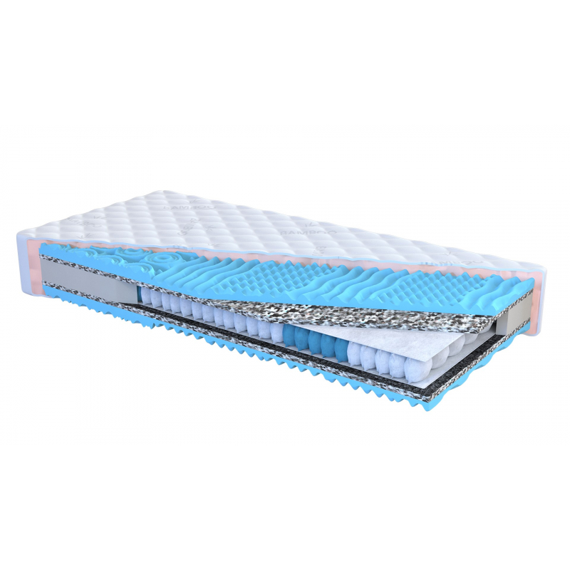 Oboustranná pětizónová taštičková matraces masážním profilem ze studené pěny, vysoce prodyšná. Materiál potahu ALOE VERA prošitý polyesterovým rounem z dutého vlákna. Materiál jádra Vysoce kvalitní taštičková pružinová kostra rozdělená do pěti anatomických zón. Počet taštiček v rozměru 200x90 je 348 ks. Vrchní vrstvy jsou vyrobeny z kvalitní pojené polyuretanové pěny typu R80 a kvalitní studené pěny typu HR4037 s masážním profilem rozděleným do sedmi zón.