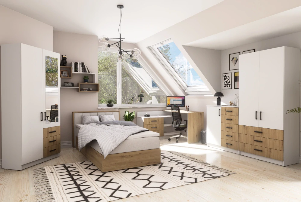 Sestava je navržena s důrazem na funkčnost a variabilitu – jednotlivé prvky spolu perfektně ladí a umožňují vytvořit harmonický celek přesně podle vašich potřeb. Nabízí dostatek úložného prostoru i praktické řešení pracovního místa, takže pokoj bude vždy přehledný a organizovaný.