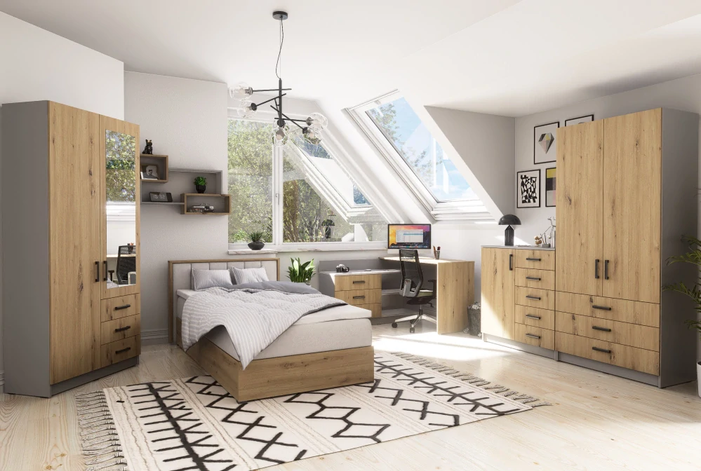 Moderní a praktická sestava nábytku SIGMA v elegantním šedém/dub provedení je ideálním řešením pro vybavení dětského nebo studentského pokoje. Díky čistým liniím a nadčasovému designu vytvoří příjemné a útulné prostředí pro každodenní život, učení i odpočinek.