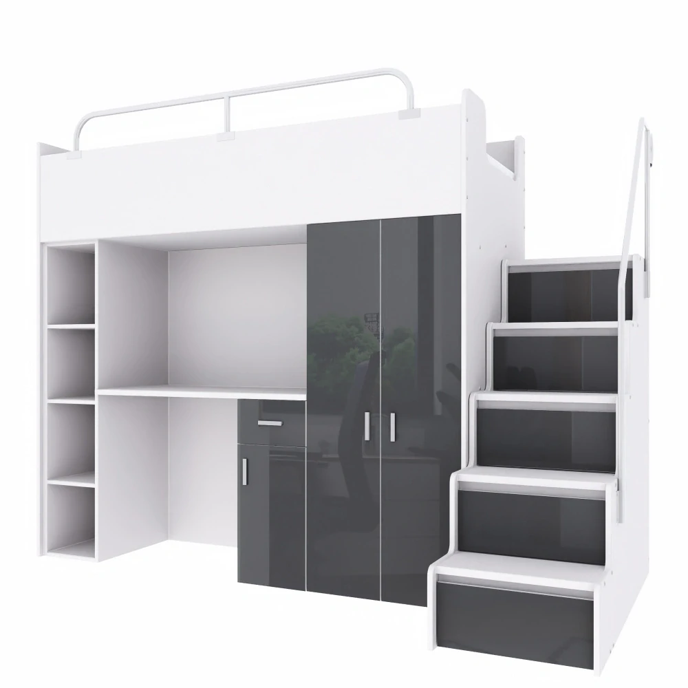 Praktické řešení do každého dětského i studentského pokoje. Tato moderní vyvýšená postel kombinuje pohodlné spaní, plnohodnotný pracovní stůl, šatní skříň i úložné schody v jednom kompaktním celku. Ideální volba tam, kde potřebujete maximálně využít prostor bez kompromisů v pohodlí.