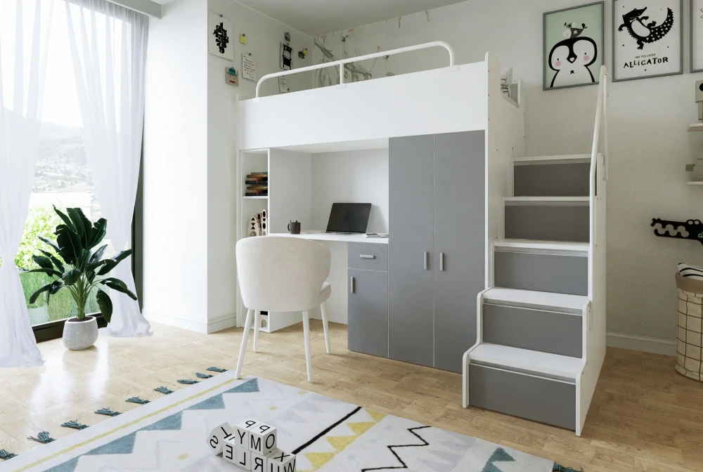 Praktické řešení do každého dětského i studentského pokoje. Tato moderní vyvýšená postel kombinuje pohodlné spaní, plnohodnotný pracovní stůl, šatní skříň i úložné schody v jednom kompaktním celku. Ideální volba tam, kde potřebujete maximálně využít prostor bez kompromisů v pohodlí.