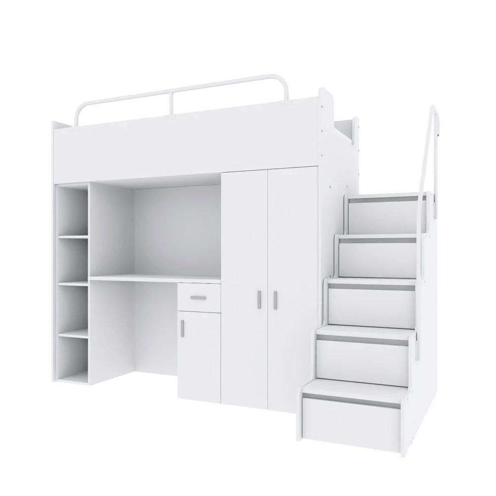 Praktické řešení do každého dětského i studentského pokoje. Tato moderní vyvýšená postel kombinuje pohodlné spaní, plnohodnotný pracovní stůl, šatní skříň i úložné schody v jednom kompaktním celku. Ideální volba tam, kde potřebujete maximálně využít prostor bez kompromisů v pohodlí.